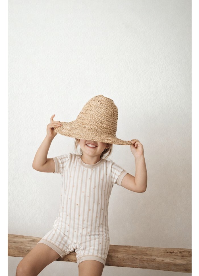 L’ouverture pratique du bouton-pression entre les jambes permet de changer rapidement et facilement les couches, ce qui rend les moments quotidiens plus simples et sans stress. À l’arrière, une fermeture à pression discrète assure un habillage sans effort, de sorte que la barboteuse peut être mise et enlevée facilement.