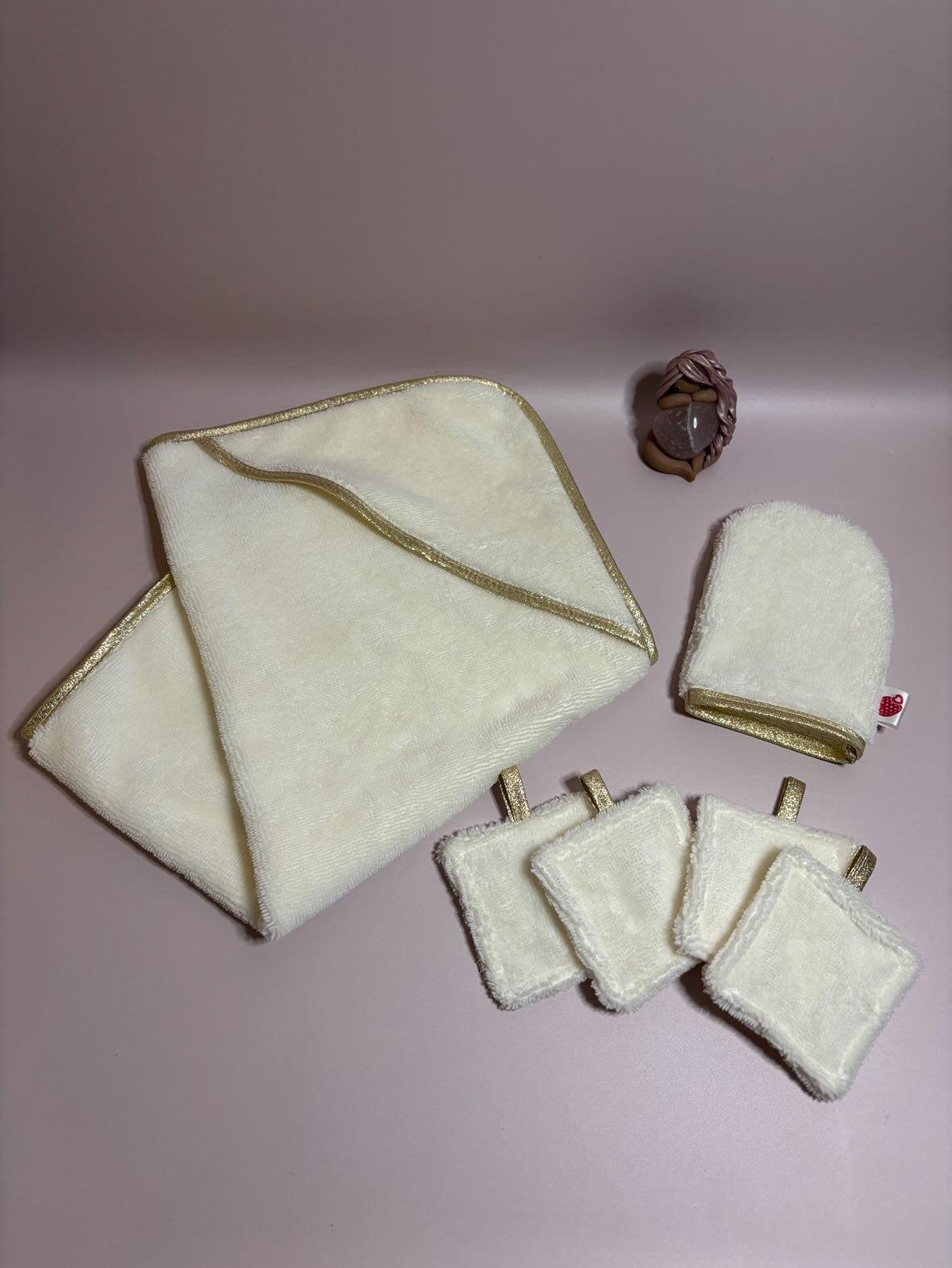 Il est composé d’une cape de bain en éponge de bambou, d’un gant de toilette et de 4 lingettes lavables assorties