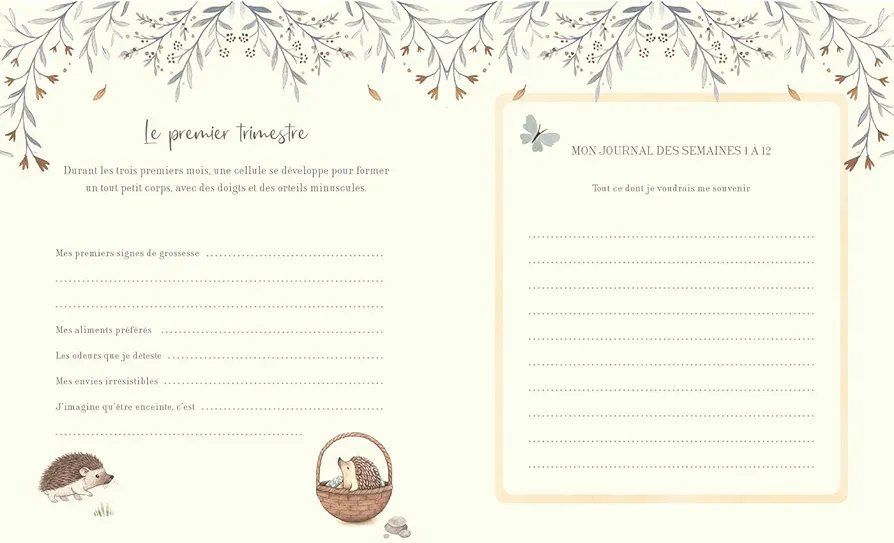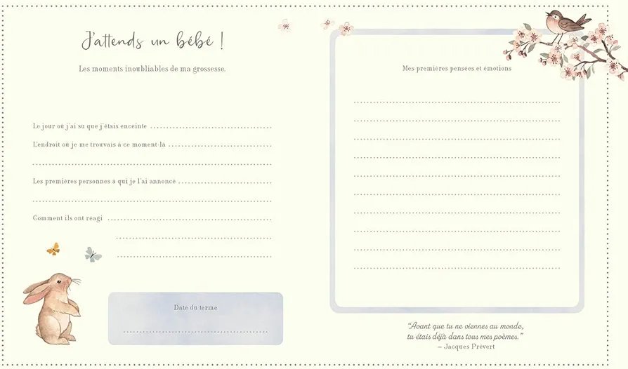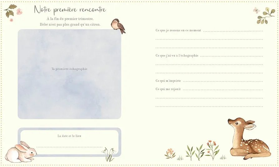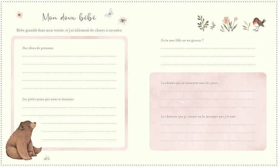 Véritable écrin de souvenirs, il offre un espace d’expression intime pour noter les dates importantes, ses émotions, ses envies, les idées de prénoms, coller des photos, garder les échographies… et se projeter avec douceur vers l’arrivée de bébé. Pensé comme un moment pour soi, il invite à ralentir et à savourer l’attente, pour créer des souvenirs précieux à transmettre plus tard à son enfant.