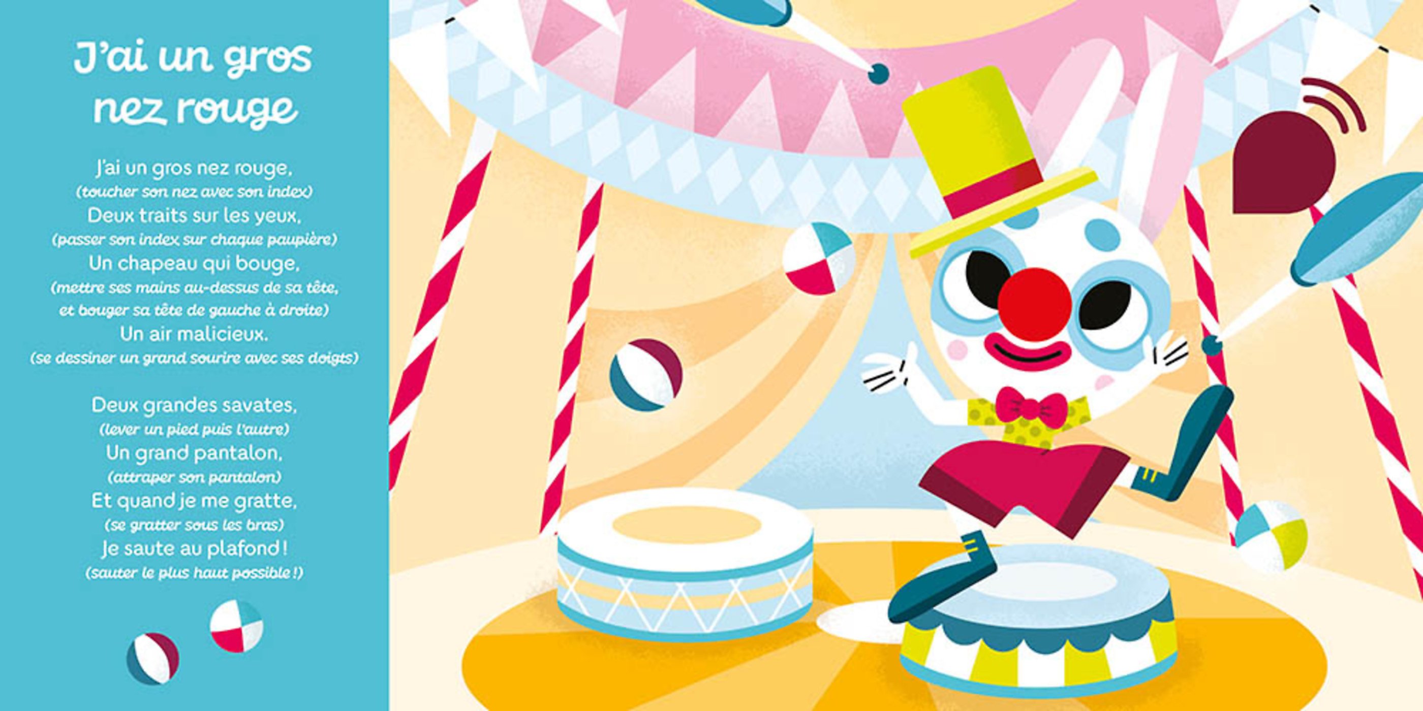 Ici, on retrouve : Ainsi font, font, font, Jean Petit qui danse, Savez-vous planter les choux ?, J’ai un gros nez rouge, Un petit pouce qui danse et C’est la baleine.