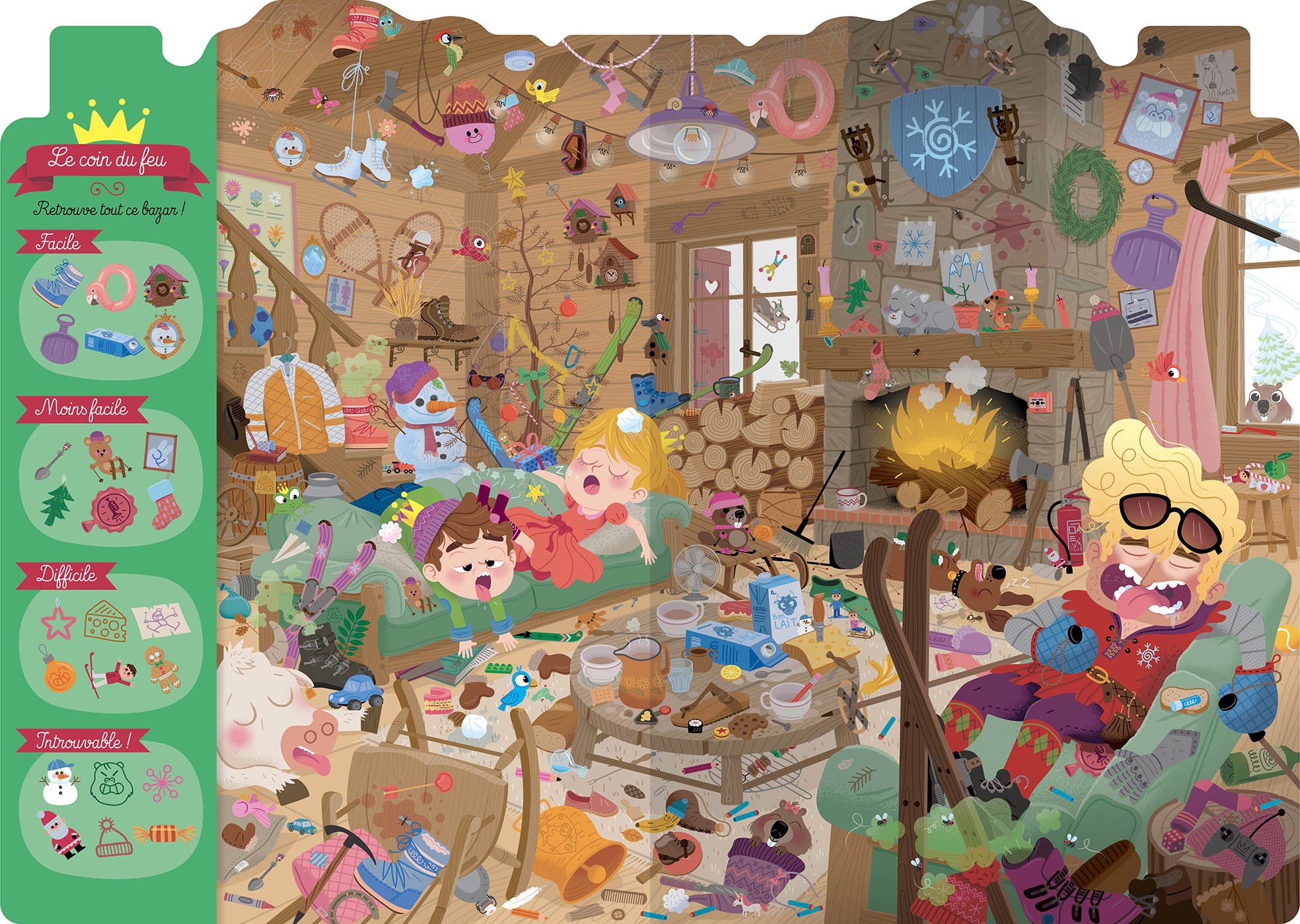 Un cherche et trouve, avec 26 éléments à retrouver par ordre de difficulté dans chaque lieu du Chalet
