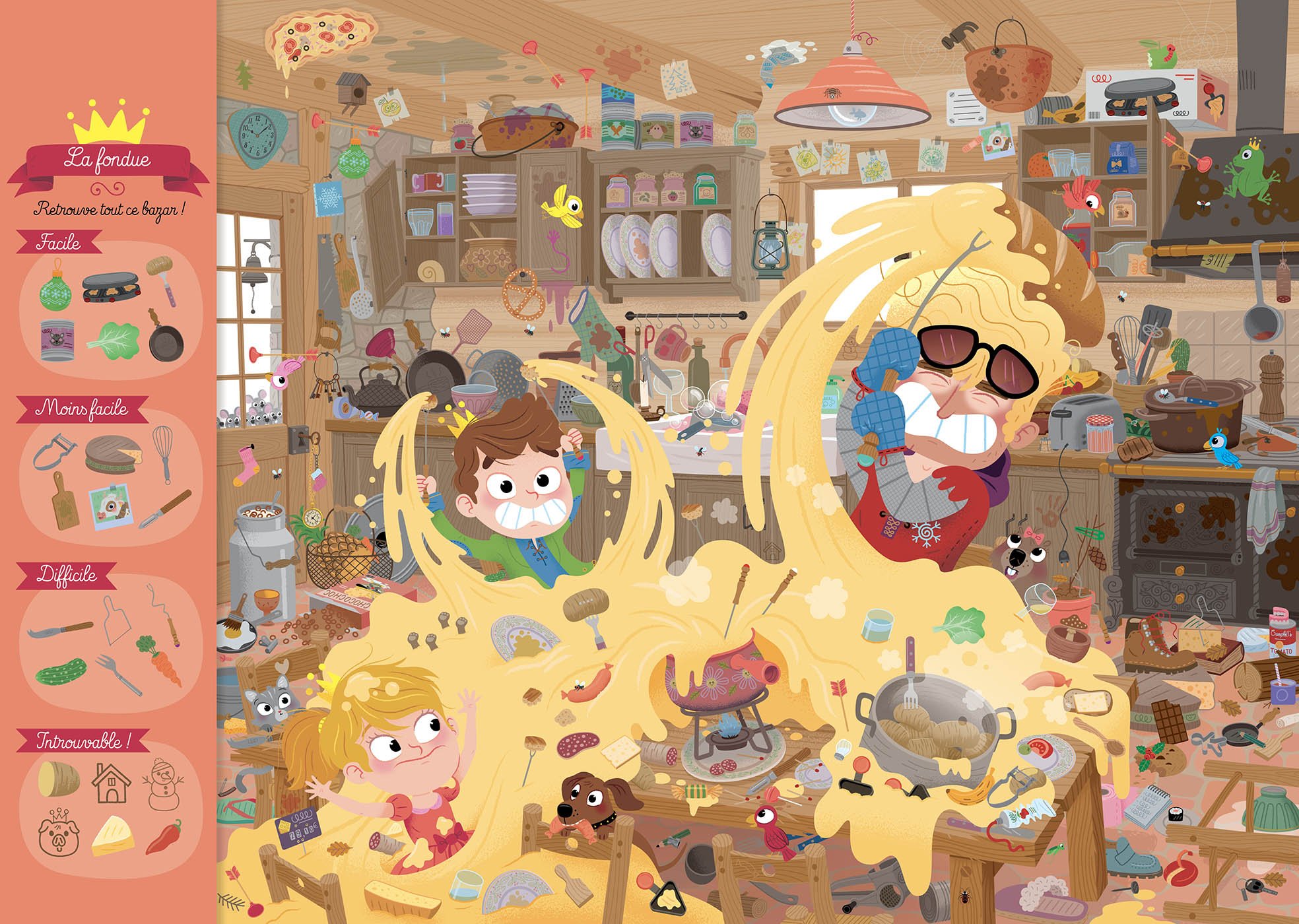 Un cherche et trouve, avec 26 éléments à retrouver par ordre de difficulté dans chaque lieu du Chalet : le coin du feu, la fondue, la piste, l’atelier, l’étable et le pâturage.