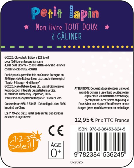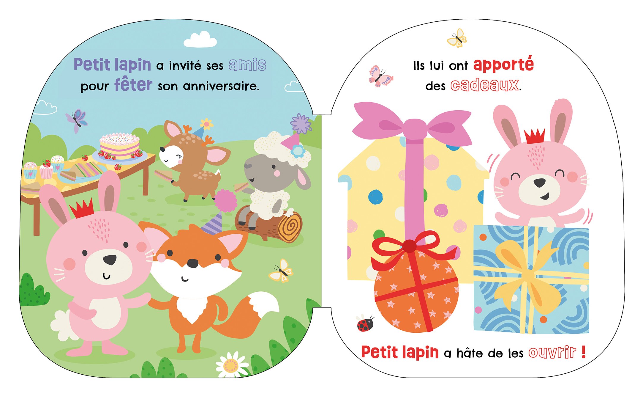 Un livre avec une couverture en mousse recouverte de velours tout doux à serrer dans ses bras, comme un doudou. Petit lapin fête son anniversaire !