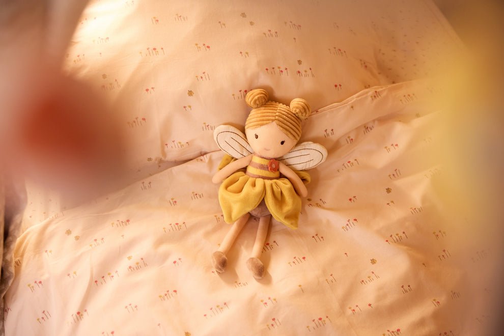 Voici Lily, la joyeuse petite abeille qui butine de fleur en fleur ! Avec sa robe aussi ensoleillée que le miel et ses adorables petites ailes, elle apporte de la lumière dans chaque pièce.