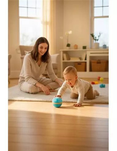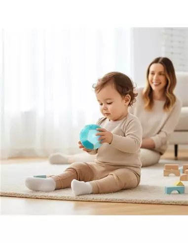 Avec son diamètre de 9,5 cm, elle est parfaitement adaptée aux petites mains : facile à attraper, lancer et faire rouler, elle stimule le développement de la motricité fine, de la coordination et de la curiosité sensorielle.